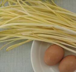 蒜黄切小段,鸡蛋打散。