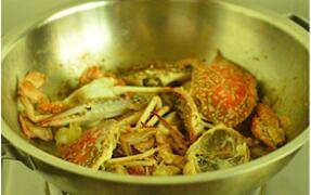 锅内放油,将姜、葱、蒜放入爆香;然后放入花蟹翻炒至变色。