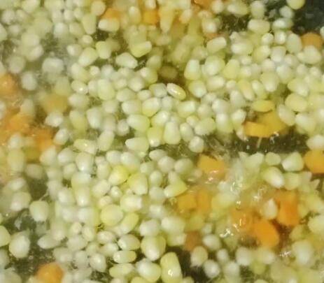 4、锅中烧水,水开放入胡萝卜玉米粒。