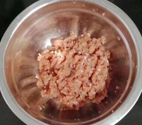 1、猪肉剁碎放入碗中,加入料酒、生抽、盐、淀粉搅拌均匀。