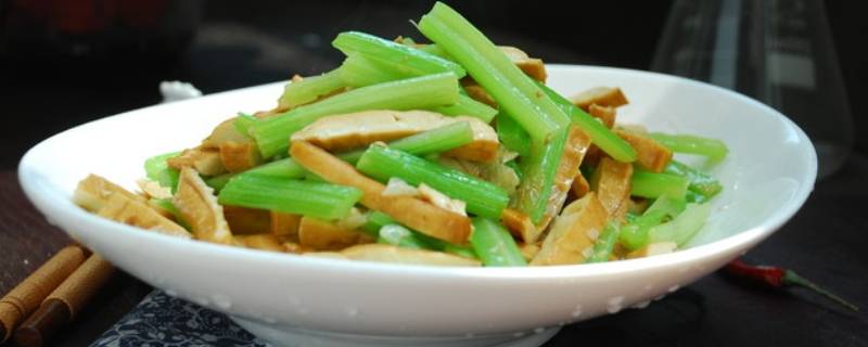 用料:芹菜260克、豆干150克、葱1段、姜2片、盐1勺、鸡粉1小勺、香油少许。