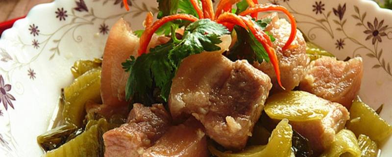 2、酸菜炖五花肉:将猪五花肉切块,焯水捞出,冻豆腐切块,酸菜片切成细丝,将锅置于旺火上,倒入植物油烧热,放入白糖熬成糖色,再放入五花肉块急速翻炒上色,添入高汤750克,放入葱段、姜片、精盐、花椒水,用大火烧开后转入小火炖至猪五花肉块八成熟时,放入酸菜丝、血肠片、水发粉条、冻豆腐块、海带丝,炖至猪花肉块酥烂,冻豆腐块嫩软入味,加上胡椒粉、味精即可。