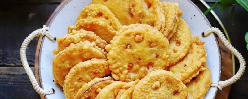 锅中倒入适量的花生油烧至六成热时,把藕盒放入面糊里均匀地裹上一层薄薄的面糊。