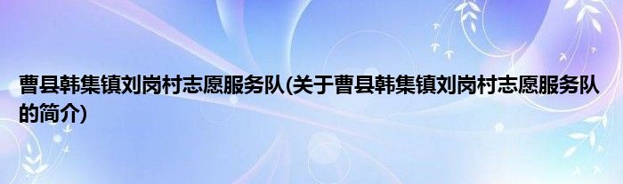 1、 曹县韩集镇刘岗村志愿服务队是由曹县韩集镇志愿服务队领导下的志愿团体。