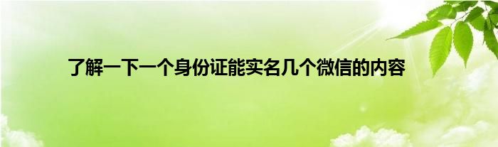 现在大家使用手机的频率越来越频繁,手机也为我们提供了许多的便利,今天小编也来说一下这个了解一下一个身份证能实名几个微信的内容相关的文章,这个操作其实不复杂,接下来就给大家介绍一下了解一下一个身份证能实名几个微信的内容,一起来看看吧: