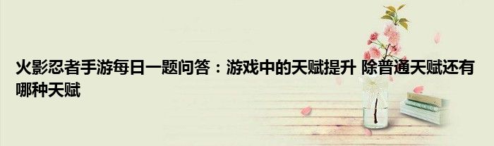 小编今天给各位玩家朋友们带来的是火影忍者手游每日一题问答:游戏中的天赋提升,除普通天赋还有哪种天赋,有记得的玩家朋友吗?不记得也没有关系,小编已经帮助大家把火影忍者手游每日一题问答:游戏中的天赋提升,除普通天赋还有哪种天赋找了出来,你只需要动动你的小手就可以轻松知道啦,快来瞧一瞧吧。