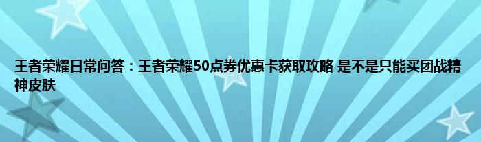 以上就是王者荣耀日常问答:王者荣耀50点券优惠卡获取攻略,是不是只能买团战精神皮肤的推荐,相信通过王者荣耀日常问答:王者荣耀50点券优惠卡获取攻略,是不是只能买团战精神皮肤这篇文章能帮到你,也欢迎对游戏很感兴趣小伙伴们一起来探讨。