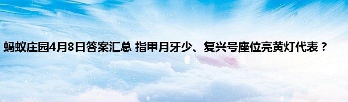 大家好,今天是4月8日,蚂蚁庄园4月8日的问题已经出来了,今天的两个问题一个和健康有关,一个和复兴号有关,问题分别是指甲上的月牙少是身体不健康的表现吗以及复兴号座位上方指示灯等中黄色灯代表什么?下面就一起来看看正确答案是什么吧。