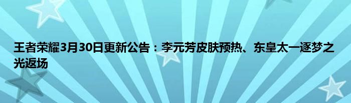 王者荣耀在3月30日迎来一次更新,这次更新的内容不是很多,主要有李元芳新皮肤预热,另外还有一些活动。s23赛季即将到来,本次将开启段位冲刺活动。同时东皇太一—逐梦之光限时返场。4.碎片商店更新。