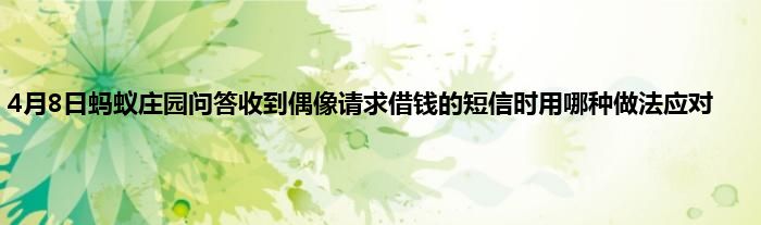 今天明哥就为小伙伴们讲解下4月8日蚂蚁庄园问答收到偶像请求借钱的短信时用哪种做法应对,相信很多玩蚂蚁庄园的小伙伴们都想知道这个答案吧,那么小编也收集到了有关4月8日蚂蚁庄园问答收到偶像请求借钱的短信时用哪种做法应对的相关资料希望大家会喜欢。