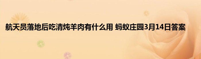 蚂蚁庄园小课堂当中会给玩家们带来一些问题给玩家来回答,只要你回答了正确的答案之后就可以得到更多的饲料,3月14日的问题已经给玩家带来更新,今天问题是航天员落地后吃清炖羊肉有什么用。很多玩家不知道3月14日答案是什么,那下面就让小编给玩家们带来这道题目答案的介绍。