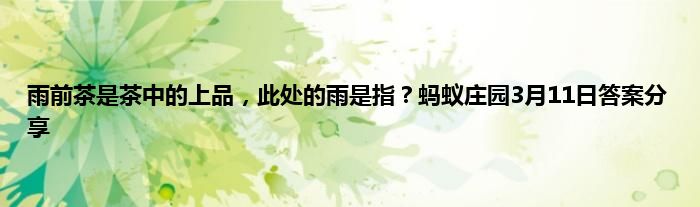 雨前茶是茶中的上品,此处的雨是指?蚂蚁庄园3月11日答案分享。大家好,蚂蚁庄园今天的问题是雨前茶是茶中的上品,此处的雨是指?清明节前的茶叶称为明前茶,谷雨节前的茶叶就被称雨前茶。那么问题的答案是什么呢,小编收集和整理了相关答案以及解析,下面一起来看看吧!