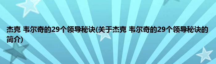 大家好,杰克。韦尔奇的29个领导秘诀,关于杰克。韦尔奇的29个领导秘诀的简介很多人还不知道,现在让我们一起来看看吧!