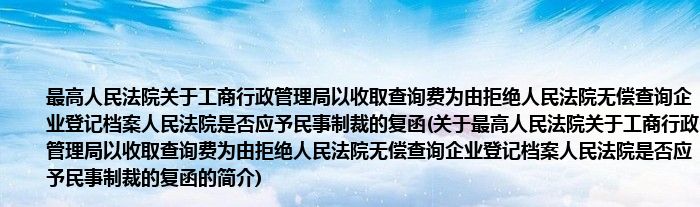 本文关于最高人民法院关于工商行政管理局以收取查询费为由拒绝人民法院无偿查询企业登记档案人民法院是否应予民事制裁的复函的简介就讲解完毕,希望对大家有所帮助。